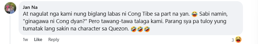 Jan Na: “At nagulat nga kami nung biglang labas ni Cong TV sa part na ‘yan. Sabi namin, ‘ginagawa ni Cong dyan?’ pero tawang-tawa talaga kami. Parang siya pa tuloy ‘yung tumatak lang sa’kin na character sa Quezon.”