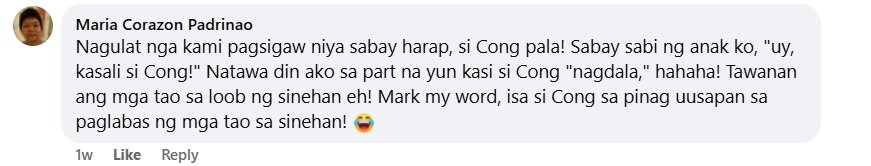 Maria Corazon Padrinao: “Nagulat nga kami pagsigaw niya sabay harap, si Cong pala! Sabay sabi ng anak ko, ‘Uy, kasali si Cong!’ Natawa din ako sa part na ‘yun kasi si Cong nagdala. Hahaha! Tawanan ang mga tao sa loob ng sinehan, eh! Mark my words, isa si Cong sa pinag uusapan sa paglabas ng mga tao sa sinehan!”
