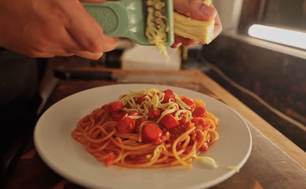 Syempre, bida rin ang Pinoy-style Spaghetti. Gumamit si Dudut ng ground beef, hotdog, bawang, at sibuyas, at nilagyan niya rin ito ng matamis na sauce gamit ang puting asukal.