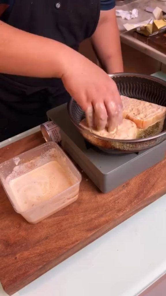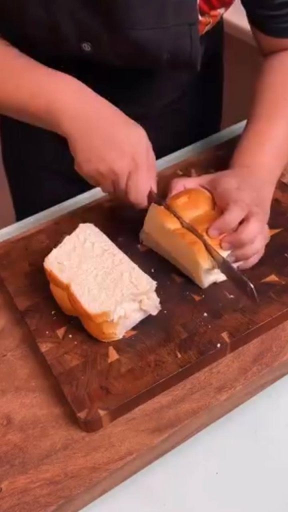 Gumamit si Dudut ng milk bun loaf, na kanyang hiniwa nang bahagyang makakapal upang mas mapanatili ang lambot at hugis ng tinapay habang niluluto. Matapos hiwain, pansamantala muna niyang itinabi ang mga piraso upang ihanda ang custard mixture na magsisilbing pangunahing sangkap ng French toast.