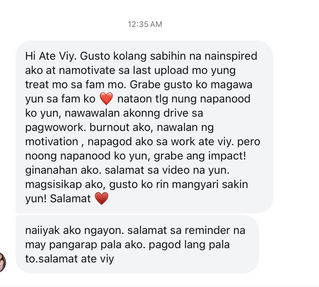 “Grabe, hindi ko inaasahan na madami akong mababasa at makikita na na-inspire sa latest vlog ko. Akala ko ginagawa ko lang ‘yung mga pangarap ko at bini-video at iuupload. Yun pala may mas malaki siyang dahilan,” caption ni Viy.