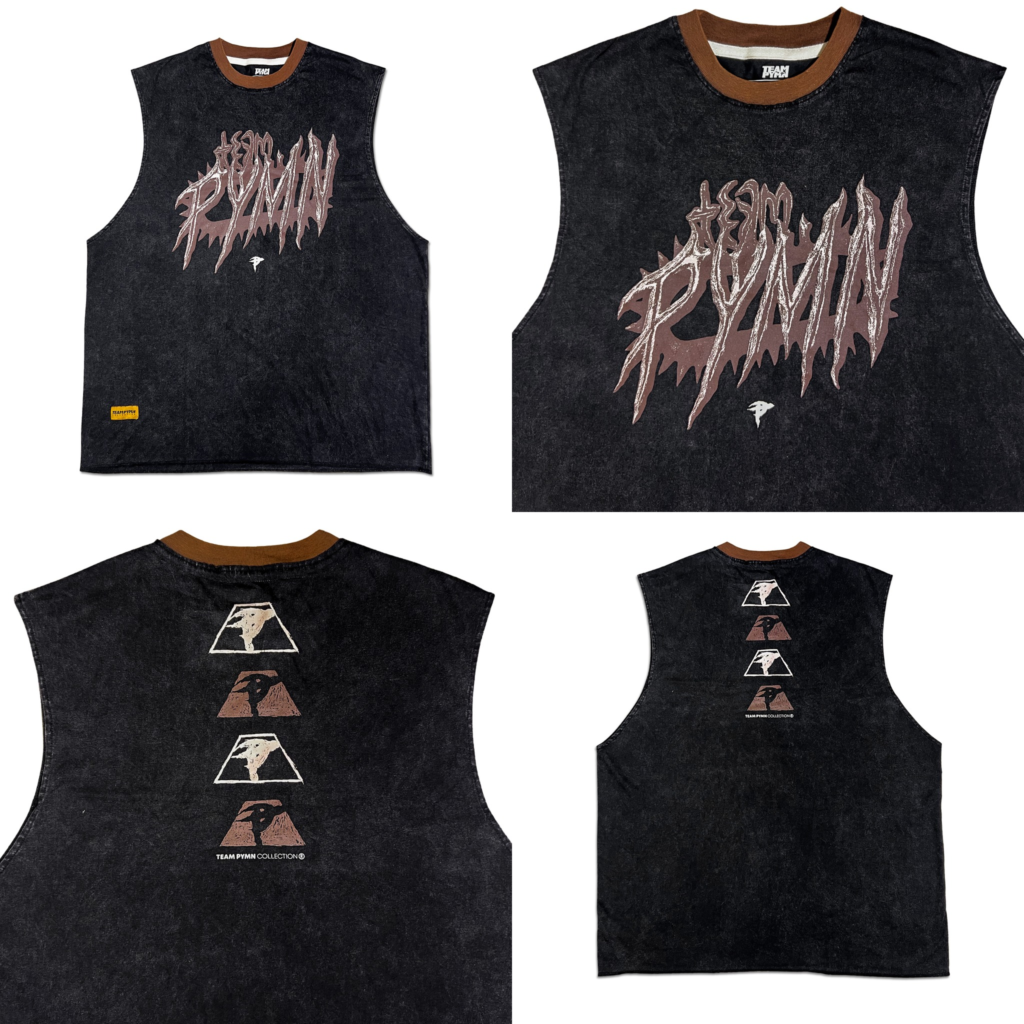 The Iron Skin is a sleeveless piece that has a large ‘TEAM PYMN’ shards font in a rusted-brown and white outline. A vertical alignment of four Payaman logos, alternating between white and rust-colored backgrounds.